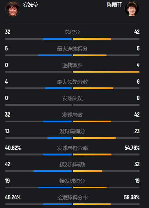 本场比赛陈雨菲攻防两端的表现都比安洗莹更加出色,在第二局受伤的情况下,仍然以大比分2-0击败了女单大魔王,完成了赛季双杀安洗莹的壮举,昂首晋级世锦赛决赛!